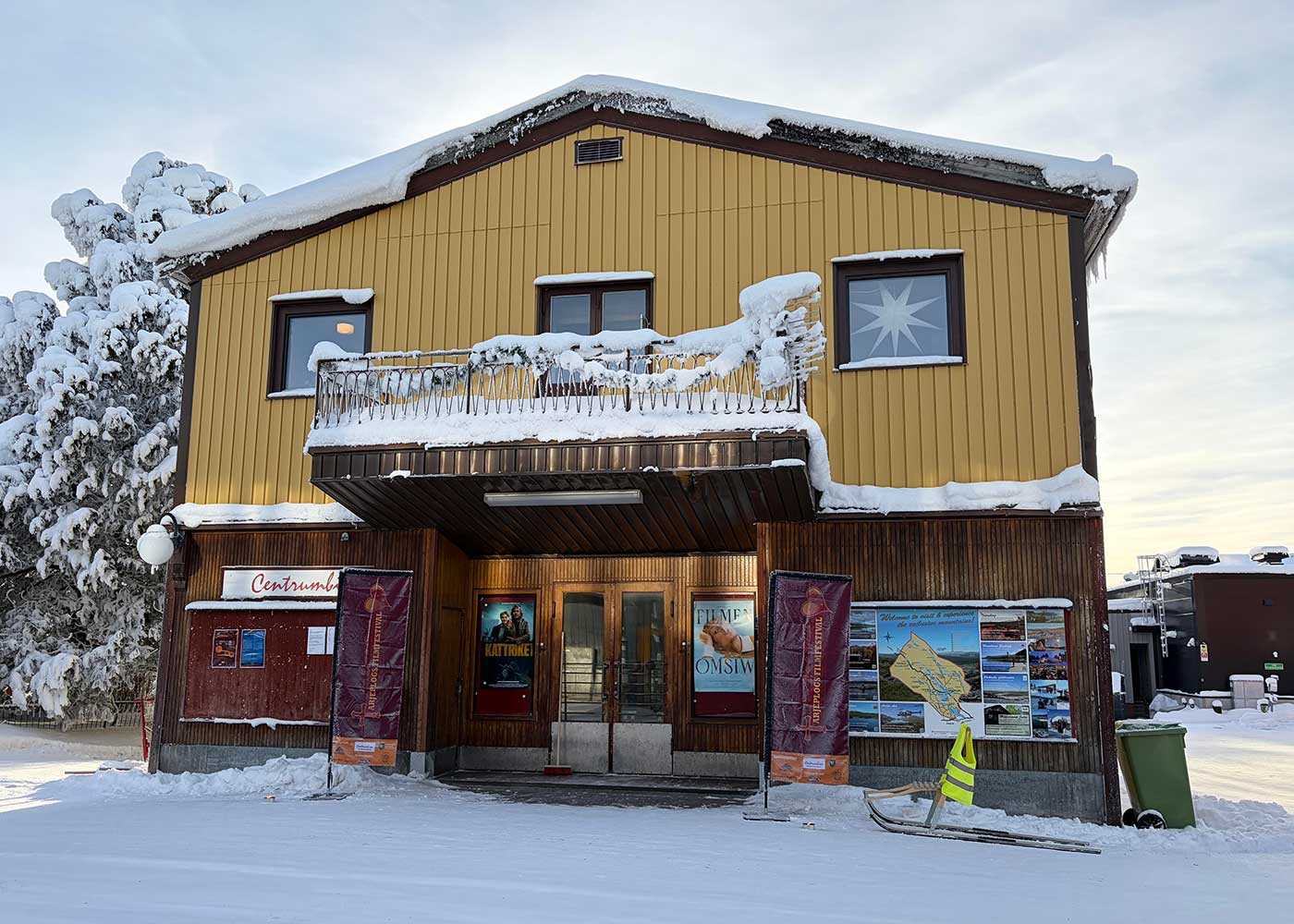 Vybild inifrån en konferenssal. På scenen sitter sju personer på höga pallar. TIll vänster i bild syns ett stort fönster.Porträtt av en kvinna som står framför en roll-up med reklam för Arjeplogs Filmfestival.Bild på huset där biografen finns. Ett gammalt tvåvåningshus i trä, med breda glasdörrar som entré. Bredvid entrén står en spark och på var sida om dörren en rollup med reklam för filmfestivalen.