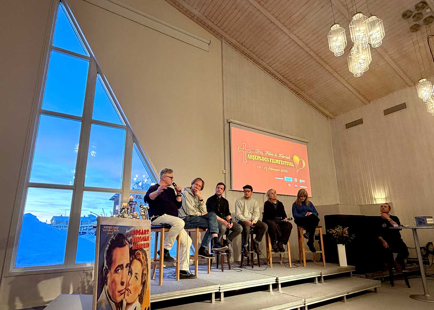 Sex personer sitter på höga pallar på en liten scen. En av dem, en kvinna, håller en mikrofon nära sin mun. Dom andra riktar sin uppmärksamhet mot henne. Bakom dem på väggen syns en bild med texten Tro, Film och Kärlek Arjeplogs Filmfestival 13-15 februari 2026. Längst till höger i bild, nedanför scenen, står en man lutad mot ett högt bord. Han håller en mikrofon i handen och tittar på kvinnan som pratar.